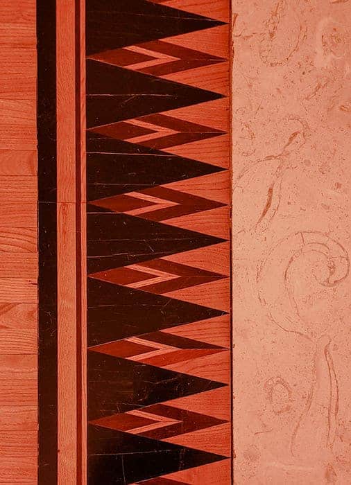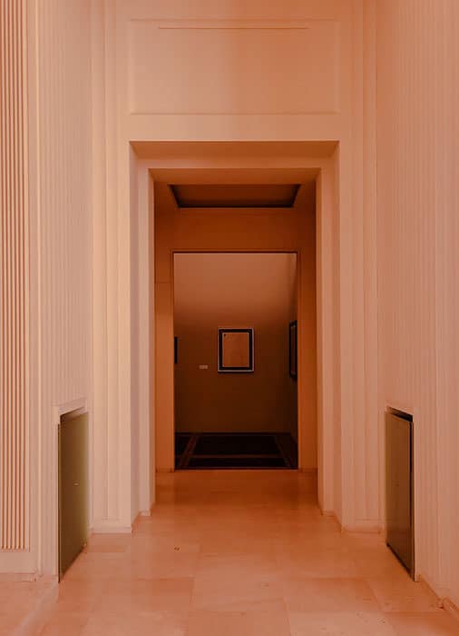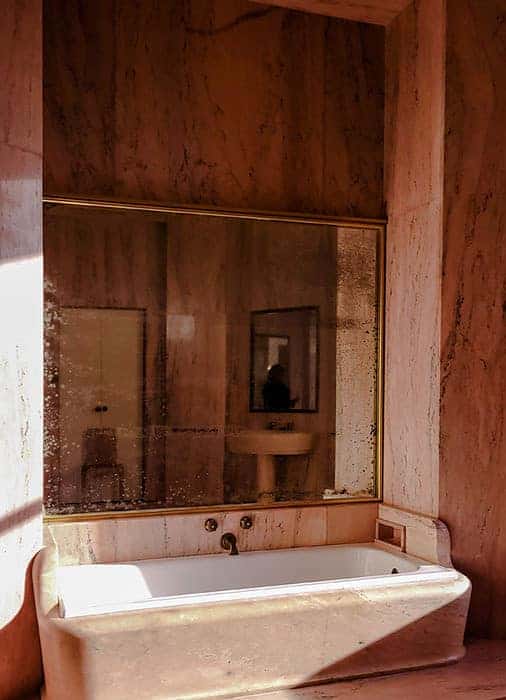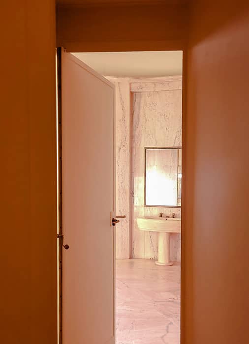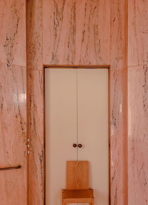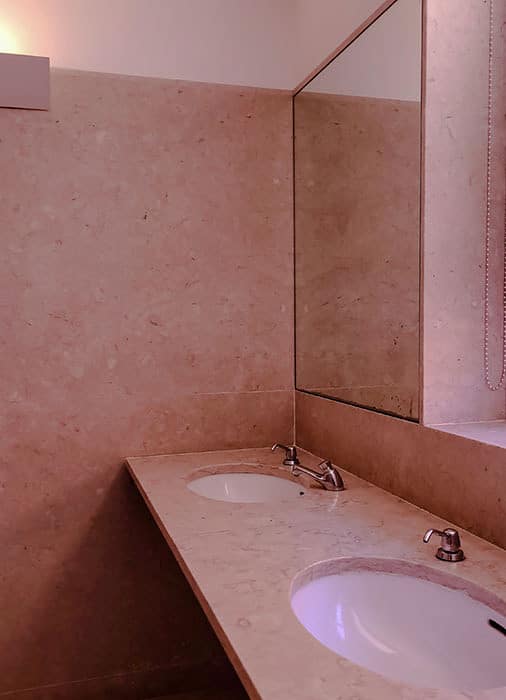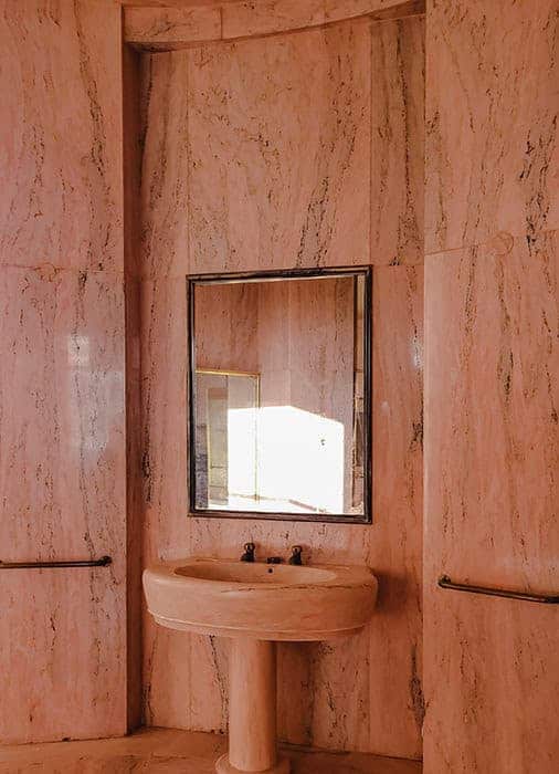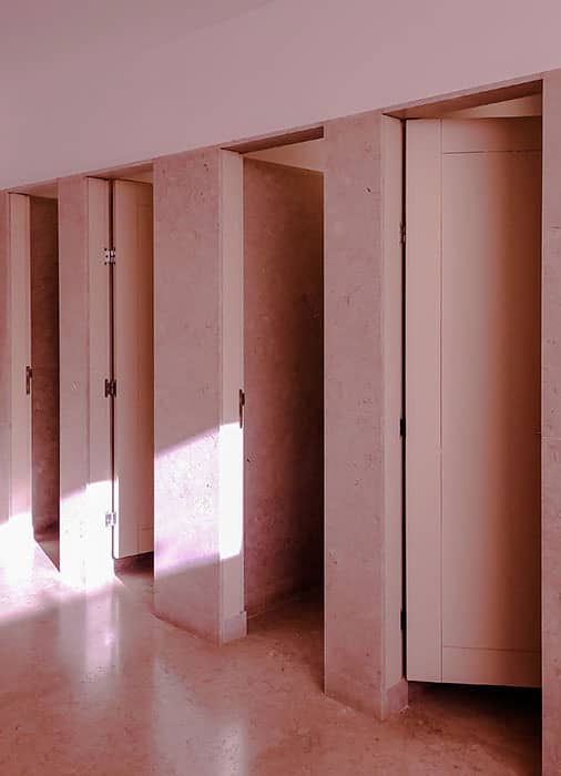 For the ladies’ toilets, a different pink marble was used. The windows let in the softest afternoon light.