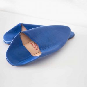 Blue Moroccan leather babouche slippers. Soft handmade slippers made in Fes.