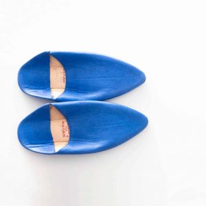 Blue Moroccan leather babouche slippers. Soft handmade slippers made in Fes.