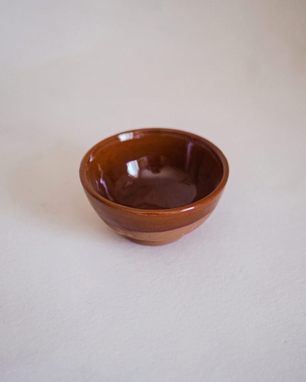 Ceramic pinch bowls made in Morocco. The tops of the bowls have a rich sienna-coloured gloss finish, and the