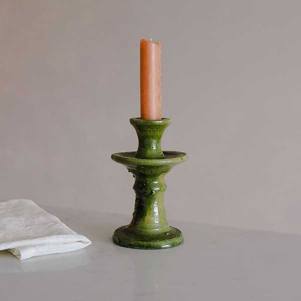 This rich olive green Tamegroute candlestick was sourced for its handmade beauty. Every stick is unique, with every mark and glaze detail specific to each. Use them on your dining table or for display on your mantle piece. They are a little piece of Morocco and bring warmth to every home.