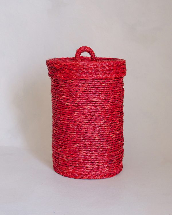 Rich red handmade basket crafted by Swazi Baskets, who create beautifully soft yet strong basketware from Eswatini. They are woven using Lutindzi grass. The grass is harvested from the ‘Etebovu’ and ‘Mantenga’ areas on the slopes of the mountains in Eswatini, dried, and then made into ropes. These ropes are coiled, woven, and sewn or finger-knitted to create their baskets.